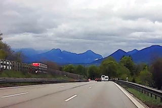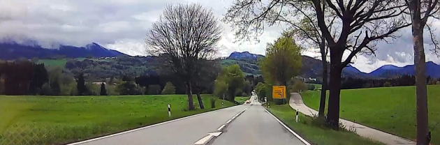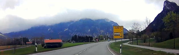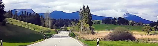 | 左:まずローゼンハイムまで110km、1時間10分の予定。出発して1時間、標識にはローゼンハイムに加え、隣国オーストリアのザルツブルクやインスブルックの地名も。 右:景色はミュンヘンの都会的雰囲気から、山岳地帯へと一変。 |