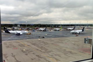 | 左:スターウォーズC-3PO塗装機のB777-200が駐機。これは国内線の機材とのこと。 右:ターミナル2(T2)の端から端へ連絡通路をかなり歩き国際線へ。T2国際線出発は初めて。 Priority Pass で入場できるラウンジへ。滑走路が見える素晴らしいロケーション。 |
