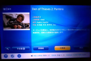 | 左:夜食の後、フライトの後半は座席のディスプレイで映画を3本ほど。 右:到着3時間前2食目。A焼魚弁当かBなすとブロッコリーのグラタンを選べ、Bを選択。 |