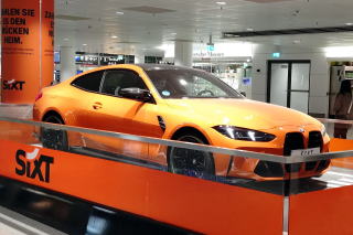 | 左:オレンジ色のBMW M4クーペは、SiXTの展示車。 右:車の貸出しはスムーズ。ただ駐車場が広く、係員に聞いても回答はばらばらで、車にたどり着くまで一苦労。ナビなどを設定し、空港着から2時間後の8時40分出発。 |