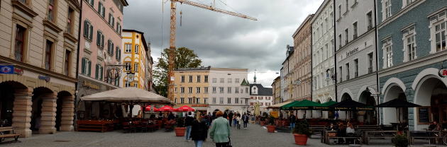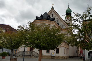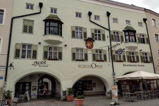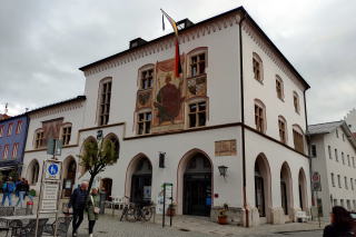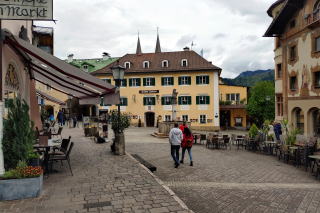 | 左:町の中心 Obermarkt オーバーマルクトと St. Peter und Paul 聖ペーターとパウル教会(1740)。 右:カフェの外壁。フレスコ画は Lüftlmalerei リュフトゥルマレライと呼ばれる伝統的な技法。 |