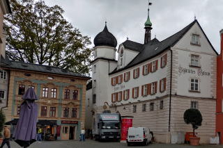| 左:広場にある二つを紹介。Hl.Johannes Nepomuk Brunnen 守護聖人聖ヨハネス・ネポムクの噴水(1773)。この町のランドマーク。 右:Holztechnisches Museum 木材技術博物館が入居している Lmeierhaus。 |