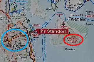 | 左:12時40分頃船着場(Ihr Standort)に到着。案内板に加筆。これから所要時間約15分の遊覧船に乗って、右の赤丸ヘレン島(男島)にあるヘレンキームゼー城へ行きます。 右:プリーンの中心にあるプリーン駅から船着場まで約2kmを、ナロー鉄道のかわいいSLが結んでいます(左案内板の青丸)。車での往来が多いため輸送機関としての役目は終えたようですが、保存鉄道として観光資源になっているもよう。乗り鉄としては、時間があれば「乗車するためだけに」プリーン駅まで往復してみたいな。 |