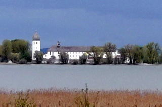 | 左:宮殿内のカフェで昼食。Cappuccino カプチーノ5.3ユーロ、Apfelstrudel アプフェルシュトゥルーデル(ウィーン菓子の代表格)8.5ユーロ、計13.8ユーロ。 右:もう一つ島 Fraueninsel 女島にある修道院が見えています。15時45分発の遊覧船で16時にプリーンへ戻りました。これからベルヒテスガーデンの宿まで80km1時間。 |