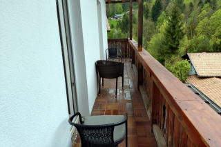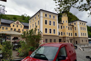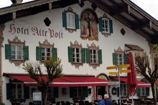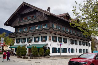 | 左:このホテルの外壁は Kreuzigung 十字架刑の図柄。 右:Hotel Wolf ホテル・ヴォルフは、堂々たる規模の木造建築(1・2階の外壁は石造かも)。公式サイトを見ると、客室はサニタリーも含めてリフォーム済みのもよう。 ここも滞在は約30分。次のミッテンヴァルトへ40km40分。 |