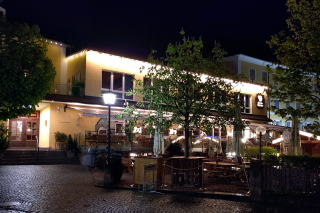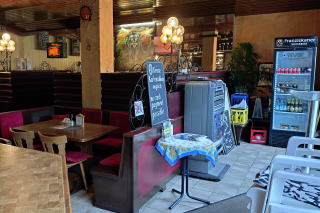| 左:時刻は18時。夕食は、地元民向けの居酒屋へ。270m、徒歩3分。 右:老夫婦二人の経営。時間が早いせいか、店内はまだ閑散としています。入口には「Keine Kartenzahlung möglich カード払いはできません。」とあります。いかにもドイツ語らしい Keine を使ったシンプルな表現。自ら Keine を使った表現はなかなか思いつかず、自分で作文すると Eine Kartenzahlung ist nicht möglich. かな。 |