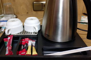 | 左:客室には電気ポットがあり、暖かいお茶やコーヒーを飲めてよかった。 右:サニタリーはコンパクトながら機能的。サウナ(写真無し)は設備が整っていました。 |