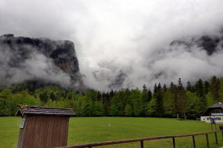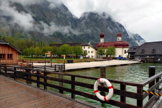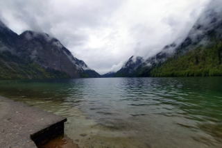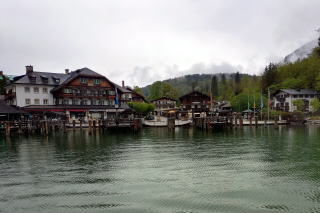 | j左:ドイツで3番目に高い Watzmann ヴァッツマン山は、雲隠れ。 右:滞在40分。10時15分発の始発便で戻ります。湖は高い岩壁に囲まれ細長くうねっているため、復路終着の船着き場は見えません。 |