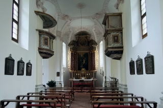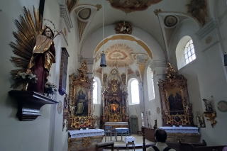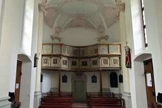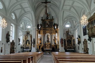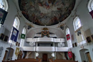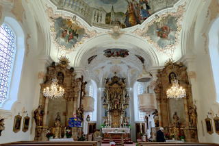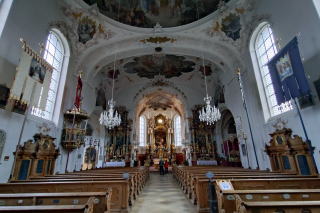 | 照明は普段落とされているはずですが、祭壇にはフランシスコ教皇の遺影が置かれ、照明により明るさを増した素晴らしい堂内の装飾がいやがうえにも浮かび上がります。 滞在は約30分。次のムルナウへ80km1時間15分。 |