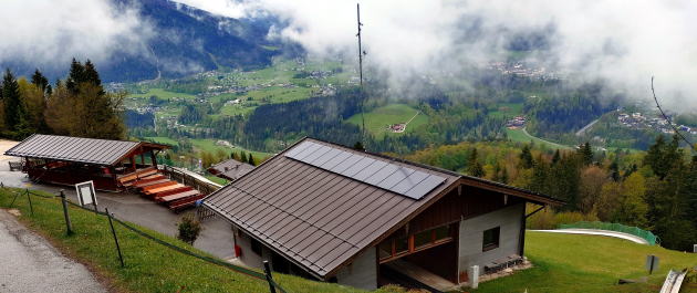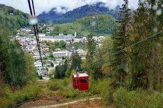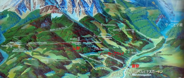 | 右側のケーニヒツ湖から戻り、宿近くの ロープウェイ Obersalzbergbahn オーバーザルツベルグバーンに乗ります。麓駅標高530mから山駅標高1,020mまで高低差490m、傾斜長さ1,530mを12分で結びます。更に山駅の左上にはヒトラーの山荘「ケールシュタインハウス」がありますが、シーズン前なので閉館中。 | |||||||||||||||||||||||||||||||||