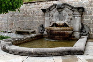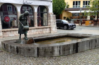 | 左:ロープウェイから戻ると、徒歩で高台にある旧市街地へ。振り返ると先ほど乗ったロープウェイが見えますが、ケールシュタインハウスは雲の中。 右:マルクト広場にある Brunnen Mutter mit Kind 水汲み母と子の噴水。母の後ろに子が隠れています。 |
