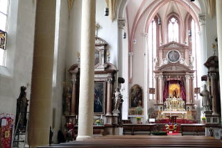 | 左:Stadtpfarrkirche St. Nikolaus 聖ニコラス教区教会(15世紀)。ゴシック様式のくくりになるものの、北ドイツの高い尖塔を見慣れた目には新鮮。 右:私が訪問した3日前の4月21日にフランシスコ教皇が死去したため、祭壇が設けられ、追悼する人々が多く訪れていました。 |