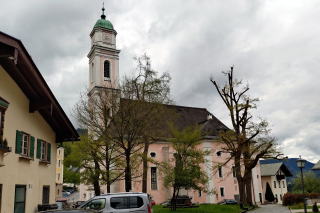 | 左:更に上って行くと市庁舎広場と市庁舎(1875)とその左上には切妻が印象的な Mundkochhaus 旧首相官邸(通称ムンドコッホ邸、1643)。ちなみにベルヒテスガーデンとは、「Perchtasgaden(ペルヒタスガデン)」という古語で、「ペルヒタ(Perchta、地域の精霊・女神)」の「ガデン(gaden、庭・場所)」を意味するとのこと。 右:市庁舎の向かいには St. Andreas 聖アンドレアス教会(1397)。 |