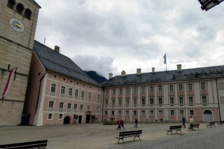 | 左:シュロス広場に面して建つ Schloss Berchtesgaden ベルヒテスガーデン城(12世紀~)。ピンク色の外壁が印象的。元修道院の城館で、現在内部は城博物館とのこと。 右:城の左手はロマネスク様式の大聖堂 Stiftskirche St. Peter und Johannes der Täufer 修道院教会(聖ペテロと洗礼者ヨハネの参事会教会、13~14世紀)。 |