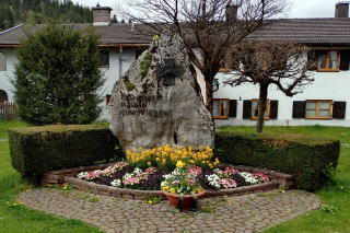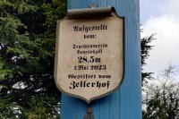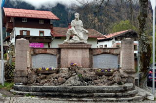 左上:工事渋滞で約20分遅れて到着。マイバウム(5月柱)。左の銘板(写真1-8-5)によれば高さ28.5m、2023年5月1日設置。右:Kriegerdenkmal 戦没者記念碑。軍人ではなく農夫の視線はヴェンデルシュタイン山(標高1,838m)に向けられているとのこと。 |