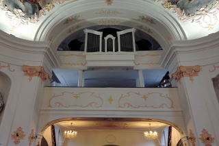 | 左:パイプオルガンは2009年製と、比較的新しい。 右:外壁側面にあった「王座の聖母マリア(1896)」。バイエルン州で最初のガラスモザイク作品とのこと。時刻は12時。次のプリーンまで西へ23km30分のドライブ。 |