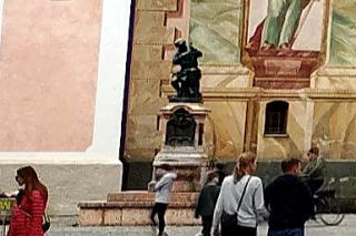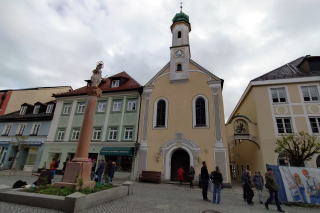 | 左:町の中心部 Untermarkt ウンター市場に建つ Mariensäule 聖母マリアの円柱。 右:カメラを右へ振ると、Maria-Hilf-Kirche マリア・ヒルフ教会(18世紀) |