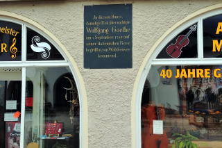 | 左:ゲーテがイタリア旅行の際に宿泊した場所に銘板がありました。ゲーテはこの町を「ein lebendiges Bilderbuch 生きた絵本」と呼んだとのこと。 右:聖ペーターとパウル教会の前に、この地にヴァイオリン製造技術をもたらした職人 Matthias Klotz マティアス・クロッツ(1653-1743)の像があります。ヴァイオリンの生産は今日まで続き、7世目になるとのこと。 |