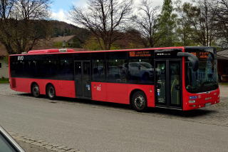 | 左:Hochstr. ホーホ通りから眺める Karwendel カーヴェンデル山(標高2385m)。ロープウェイで一気に山頂まで登れるとのこと。 右:単車バスでありながら、ロングボディにのけぞりました。調べたら MAN Lion's City LLE NLの3軸車、2扉、全長14.705mで、日本では通常12m未満なので、2.7mも長い。 ここも滞在は30分程度。宿まで45km、45分。 |