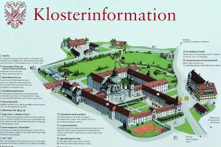 | 左:前後しますが、ここからは帰り道の写真。修道院敷地内には、農場、Gasthof 旅館・ホテル、Gymnasium 高校、醸造所などがあるとのこと。 右:案内板。こんな片田舎にこれだけの施設をよく作ったものです。 |