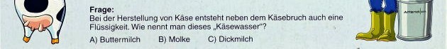 | Q:チーズの製造過程では、チーズの凝乳に加えて液体も生成されます。この液体「チーズウォーター」は何と呼ばれていますか。 A)バターミルク B)モルケ C)濃厚なミルク 恥ずかしながら安易に挑戦したら解けない。消去法でいくと、A)バターミルクやC)濃厚なミルクはなさそうなのでB)モルケかな。ネット検索すると「ホエイはドイツ語でモルケ (Molke)といい、チーズを作る過程にできる液体。」とあり、辛くも正解でした。 このページ2025年11月作成。 |