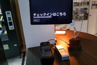 0.5L2.99ユーロ。白ワインFreixenet Medium Dry 0.2L5.99ユーロ。 右:ネットで調べたらフロントで電気ケトルを貸してくれるとあったので、フロントに行ったら、たまたま日本語表記の自動チェックイン機に気付きました。フロントで聞いたら、中国人スタッフが準備したとのこと。結局電気ケトルは貸し出せる在庫がなく、カップにお湯を入れてくれました。 |