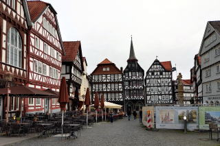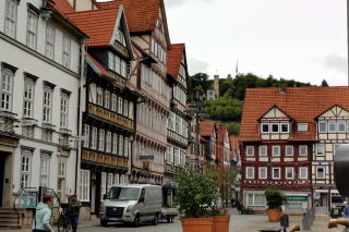| ドイツ到着10日目、ケルンの宿を引き払い、フリッツラーとハン・ミュンデンを経由してゴスラー郊外の宿まで380kmほど走ります。到着地ゴスラーに近いヴェルニゲローデの天気予報は曇り、予想最高気温13度、最低気温4度で、昨日より更に下がります。 ●メルヘン街道沿い、木組みの街並みが残る町  |