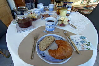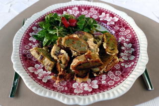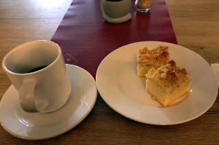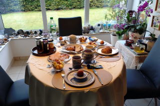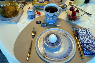 | 左:到着時の夕食。手料理でもてなしてもらいました。 ドイツ到着12日目。滞在地ロストックの天気予報は晴れ、予想最高気温17度、最低気温7度で行楽日和ですが、長旅の疲れで、終日知人宅で休養させてもらい、外出しませんでした。  |