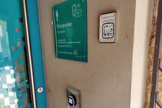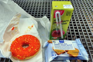 | 左:昼食は、朝食時に調達したもの。つまりオールインクルーシブに含まれます。 右:公衆便所も、現金は使えずタッチ決済になってました。  |